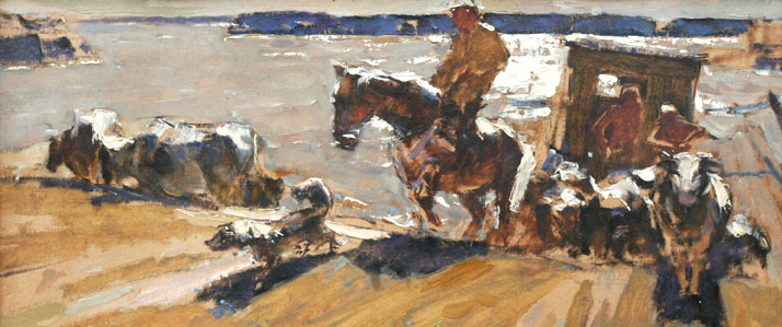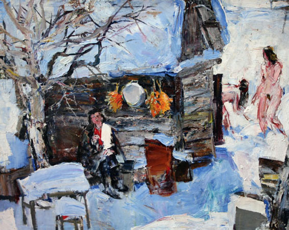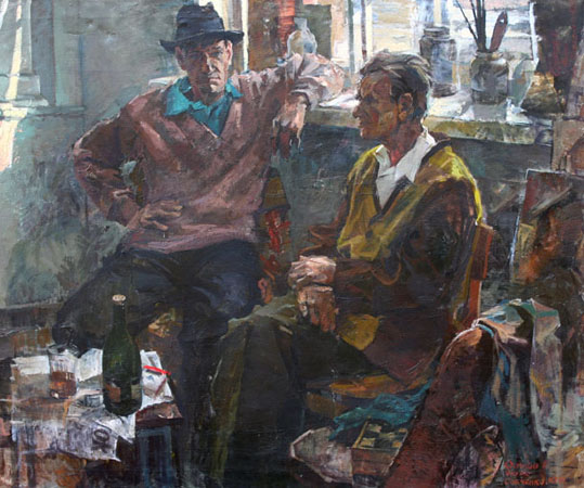 Хорошо смотрится в советском контексте и работа Александра Суслова «Художники на БАМе» — выразительное свидетельство не только эпохи, но и способа существования художников в любые времена, что бы не происходило за окном мастерской, — полет Гагарина в космос, военный конфликт с китайцами на острове Даманский, строительство БАМа, гласность и перестройка, дефолт 1998 года или просто очередной инсульт власти… Примечательно, что мирно выпивающие художники, коротающие зимний таежный вечер за бутылкой водки и банкой какой-нибудь кильки в томате, — это наши земляки, живописцы из Владивостока — Владимир Цой и сам автор, которые работали и поддавали в творческой командировке на БАМе. Так в охотку и в радость на фоне маяка в Сидеми опрокидывает стопку приморский живописец в работе Анны Щеголевой «Художник на пленэре», так осенним вечером на острове Попова принимают на грудь, поют и спорят об искусстве художники в ее же картине «Август, луна и сверчок». Дай им Бог и дальше здоровья, новых пленэров и свежих работ.