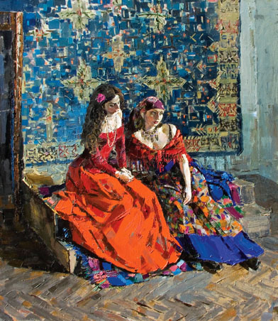 В такие вечера можно петь, как это делают персонажи удивительно красивой по живописи картины Ильи Бутусова «Вечернее пение», а можно и пригласить девушек, что возникают на полотнах Александра Арсененко «Вермутас» и «Огурчики». Ах, эти бескорыстные милые девушки из окружения художников, их безотказные натурщицы и верные поклонницы, как бы обеднела русская живопись, не будь их. Но, к счастью, они есть всегда. И такие прелестные, как девушка с рюмкой вермута в руке, смотрящаяся в зеркало и окруженная сверкающим зеленым полднем, и такие озорные, как натурщица с банкой огурцов на коленях, по-видимому, так до конца и не решившая, что же сделать с добытым огурчиком — то ли закусить им, то ли использовать для другого удовольствия.