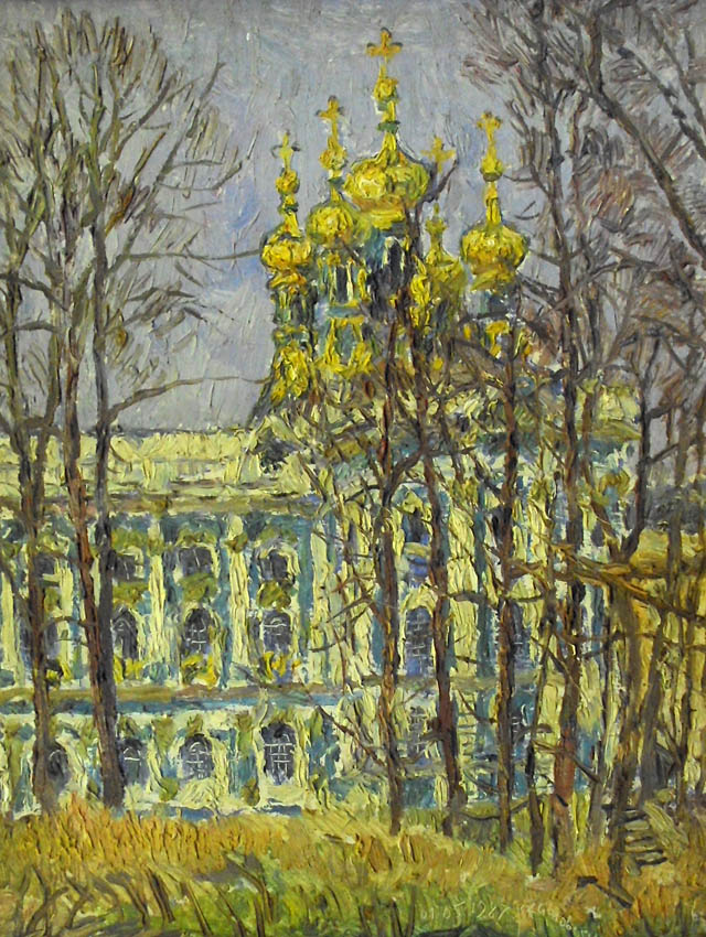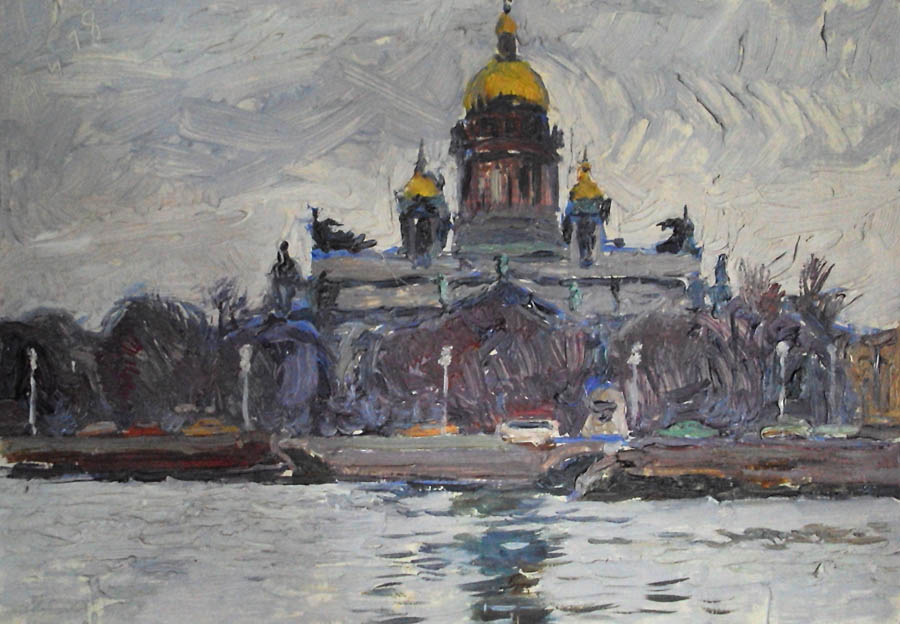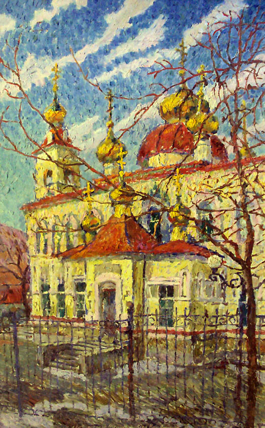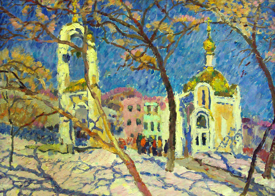 Смольный монастырь, Александро-Невская лавра, церковь Екатерининского дворца в Царском селе, Собор у Балтийского вокзала, Исаакий, церковь на Мойке в Ленинграде, церкви Нижнего Новгорода, собор Василия Блаженного в Москве, часовня Святой Татьяны, храм Серафима Саровского, храм иконы Казанской Божией матери, собор Успения Божией матери, Покровский храм во Владивостоке… Работы фиксируют не только памятник зодчества, но и состояние природы, времени года, времени дня. Решаются определенные художественные задачи — положить снег у стены храма, передать вечернее освещение… Однако импрессионистский подход художника позволяет создать не живописное, а в некотором смысле летописное полотно.