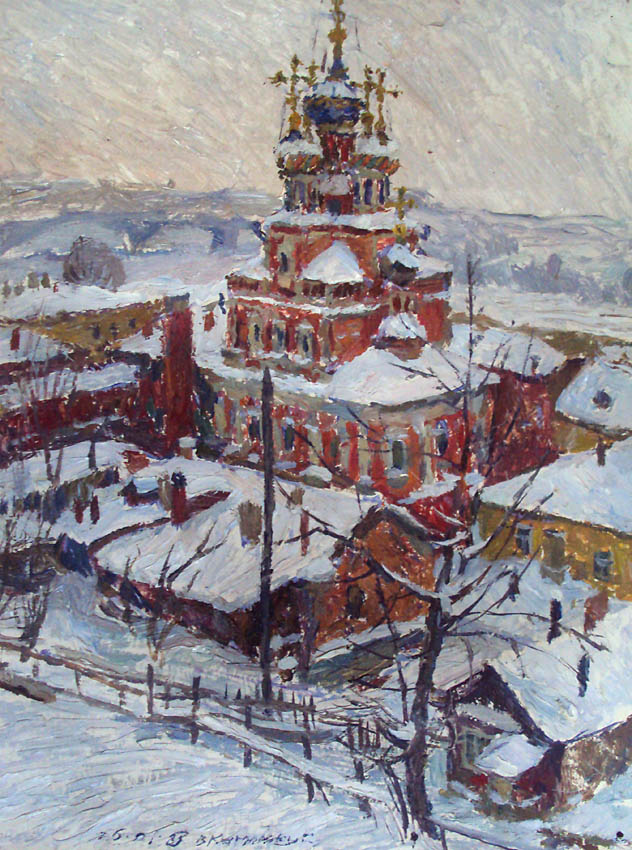 Если говорить о Владивостоке, то Владлен Камовский буквально следует за историей воссоздания разрушенных в советское время храмов и строительства новых. Пишет их не один раз, выстраивая разные перспективы и воссоздавая живописными средствами обыденную городскую среду, дающую материал для жанра городского пейзажа, в которой храм является обязательной составляющей, поскольку без него немыслим (со времени принятия христианства Русью) ни один городской ландшафт.