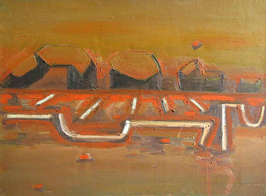 Произведения Евгения Орлова, черпающего вдохновение в природе и архитектуре Русского Севера, являют собой пример балансирования на грани между абстракцией и фигуративной живописью. Среди комбинаций различных геометрических форм хорошо читаются храмы, дома, люди. Чистота, звучность цвета, умело использованные цветовые и графические контрасты рождают ощущения особого, одухотворенного состояния.