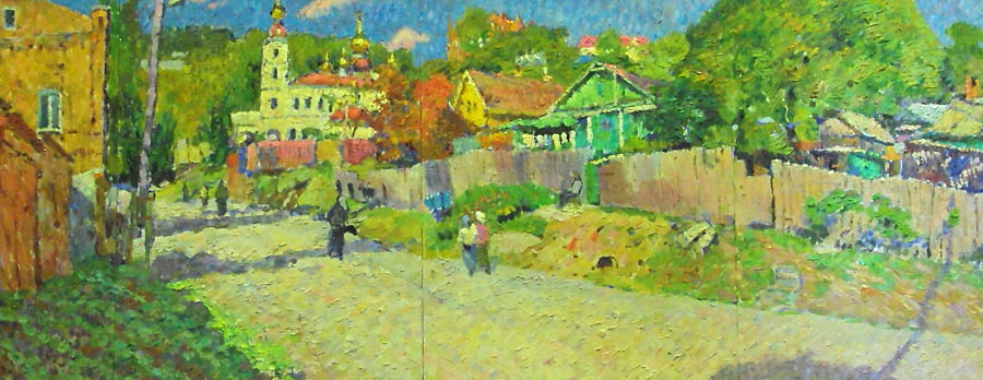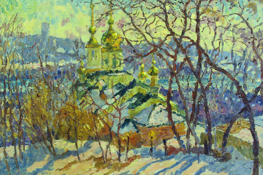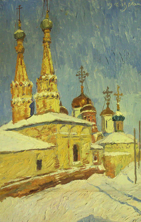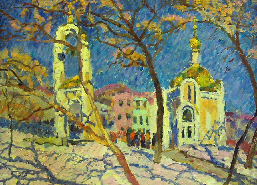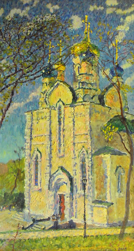Если говорить о Владивостоке, то Владлен Камовский буквально следует за историей воссоздания разрушенных в советское время храмов и строительства новых. Пишет их не один раз, выстраивая разные перспективы и воссоздавая живописными средствами обыденную городскую среду, дающую материал для жанра городского пейзажа, в которой храм является обязательной составляющей, поскольку без него немыслим (со времени принятия христианства Русью) ни один городской ландшафт.