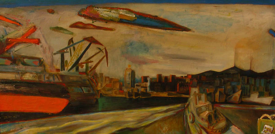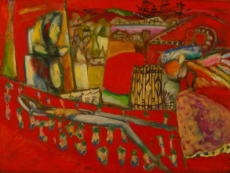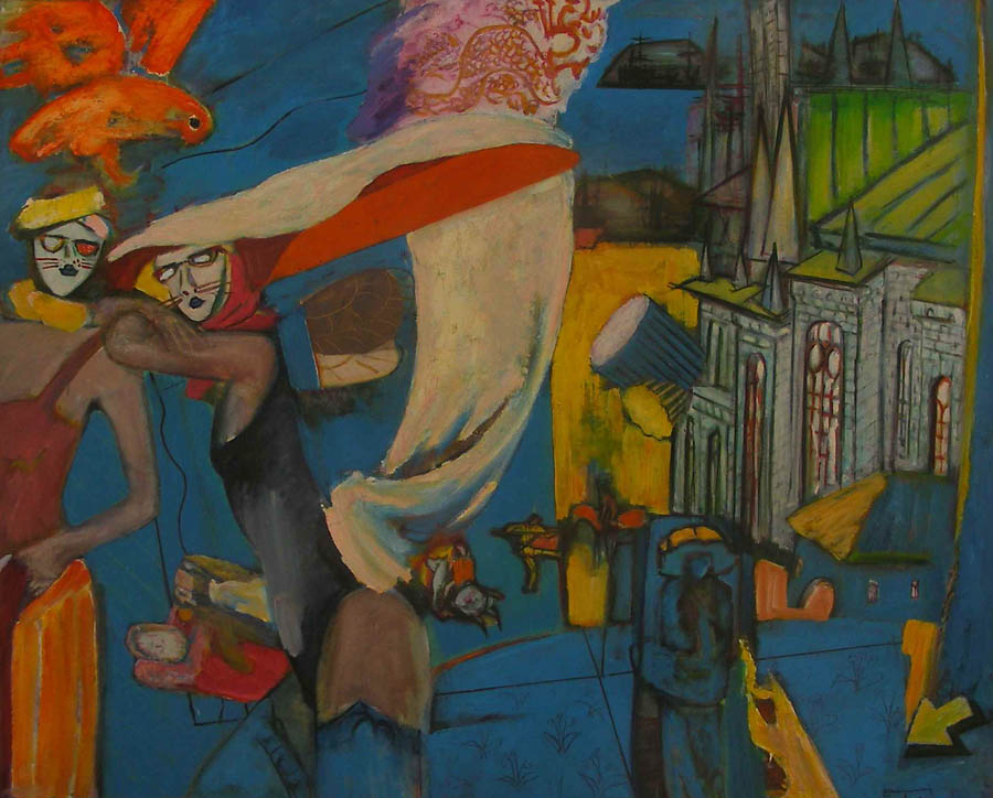 И вот тут-то вступают в силу и магия сюжета, и магия графики, которые особенно проявляются в некоторых фантастических, но одновременно смешных и радостных работах художника. Впечатление от них можно сравнить с подарками детства, когда ещё, слава Богу, с миром может произойти всё что угодно детской душе. Что прежде всего делают с подарком? — ну, конечно, разворачивают. Хорошо бы вообразить грубую, ещё советской поры обёрточную бумагу, цвета прошлогодней палой листы, с прожилками сохранившейся древесины, которая в руках родителей постепенно раскрывается, словно оболочка привычной реальности, — и перед глазами вдруг предстаёт, ну, скажем, горящий опереньем петух, восставший над всеми деревенскими окрестностями, законодатель распорядка дня и усмиритель нравов. Или несущаяся по улице со всех своих лап гигантская курица, сшибающая городьбу, потому что её буквально распирает от желания разнести свежие местные новости, что кипят в её куриной голове. Или многочисленные рыбы автора, сверкающие, словно ожившие ёлочные игрушки, явно заплывшие в сегодняшнюю жизнь из сказок, мифов или снов, но вместе с тем обладающие своим характером и наделенные таинственной властью, по крайней мере, над нашими чувствами.