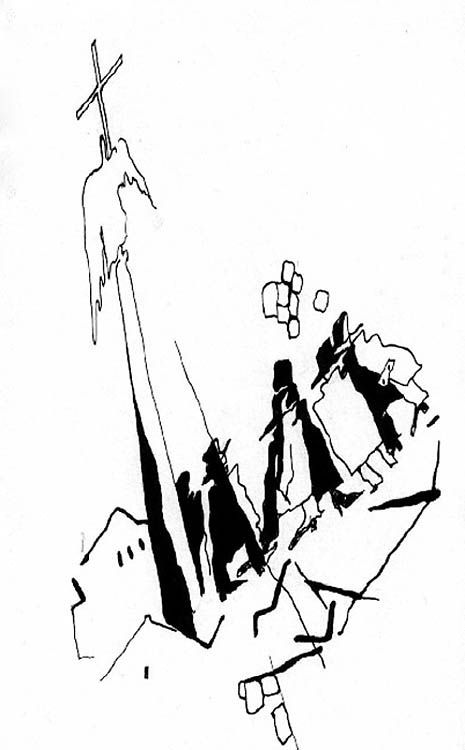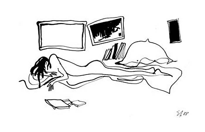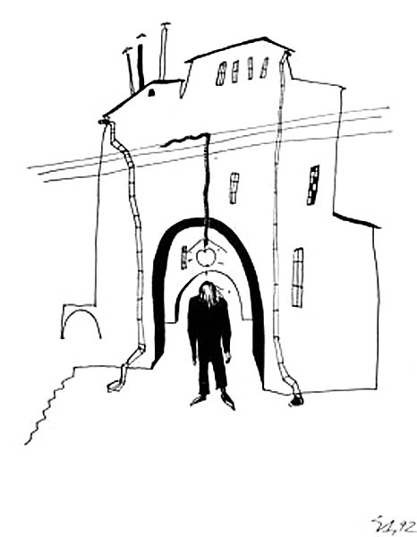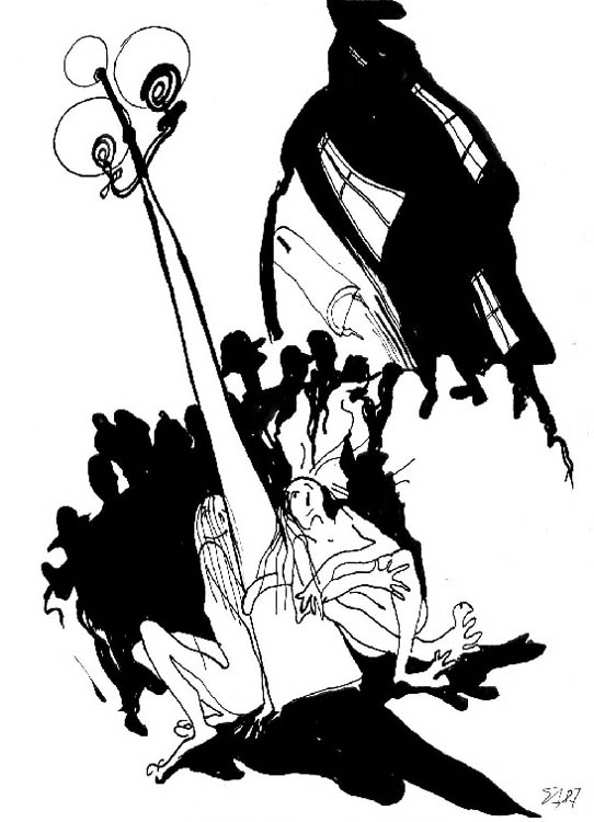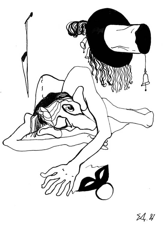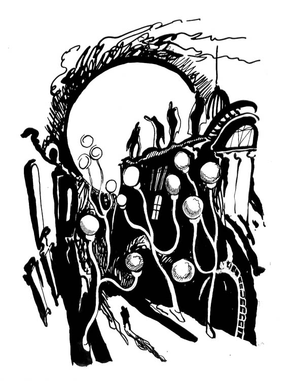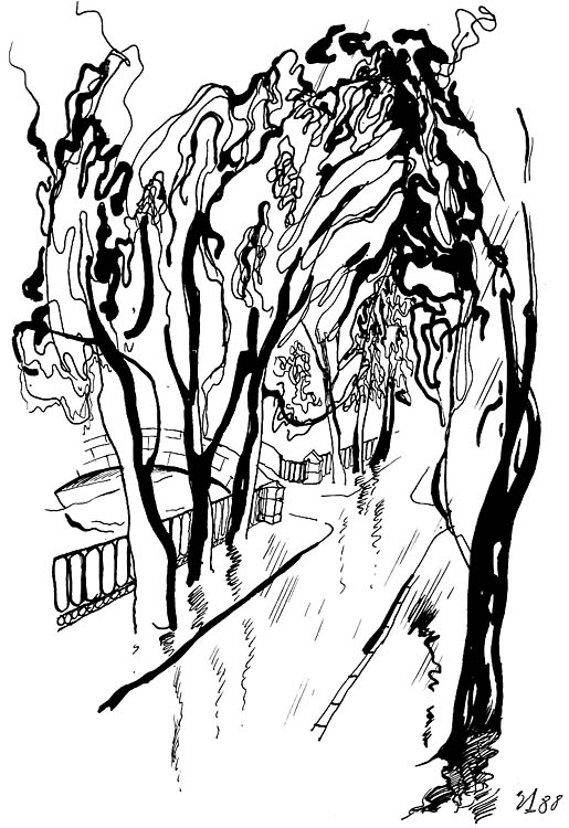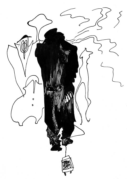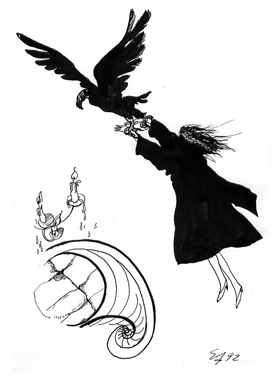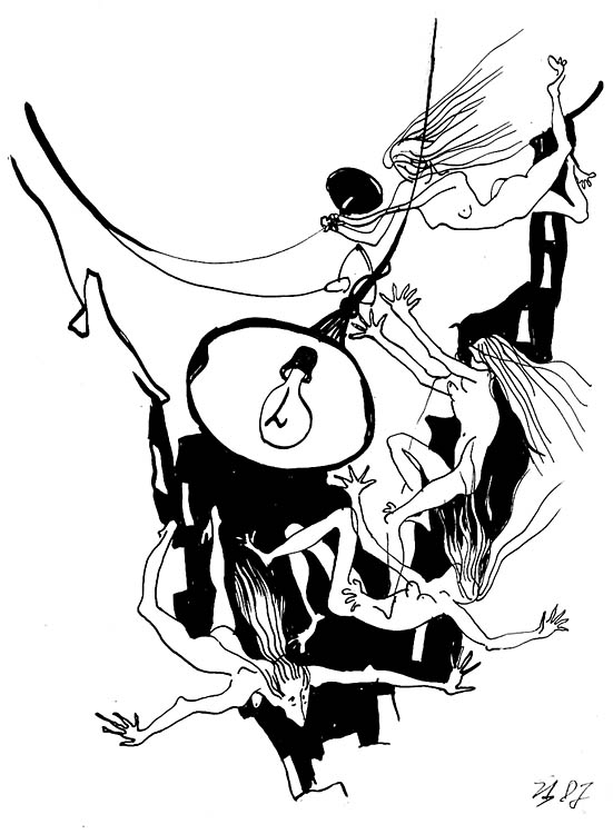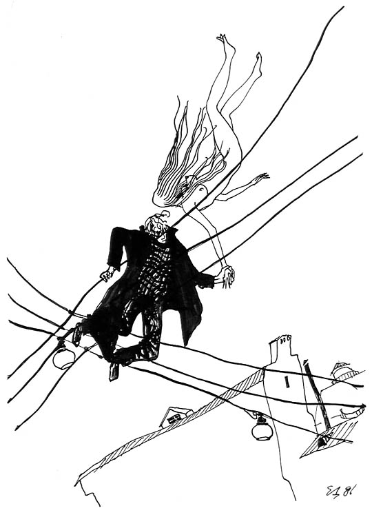 Действительно, мои графические картинки периода конца 80-х, начала 90-х можно так назвать, хотя это не иллюстрации к роману Булгакова. Это было время открытий. Время чтения, перечитывания, передачи из рук в руки этой книги. Время, когда мы стали жить иначе, когда что-то рухнуло безвозвратно, а новое ещё не построено, от этого в наших умах бродили надежды и иллюзии. Мы играли в мистику, у нас были свои 50-е квартиры, свои балы, свои крыши и полёты, и поэты, и Маргариты… Кстати, Библию многие стали читать именно после «Мастера и Маргариты». Казалось, вот-вот произойдёт что-то важное, великое и вся жизнь изменится, мы из подполья выйдем на крышу! Это состояние точно было у всех…