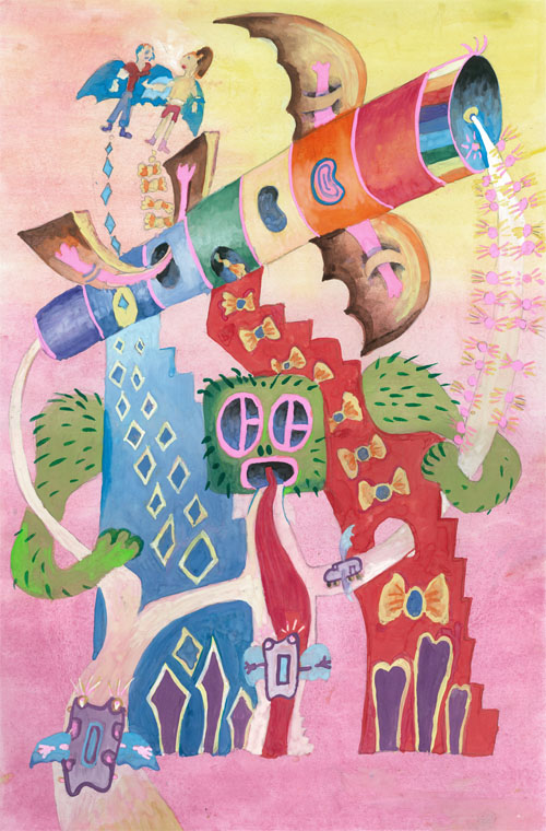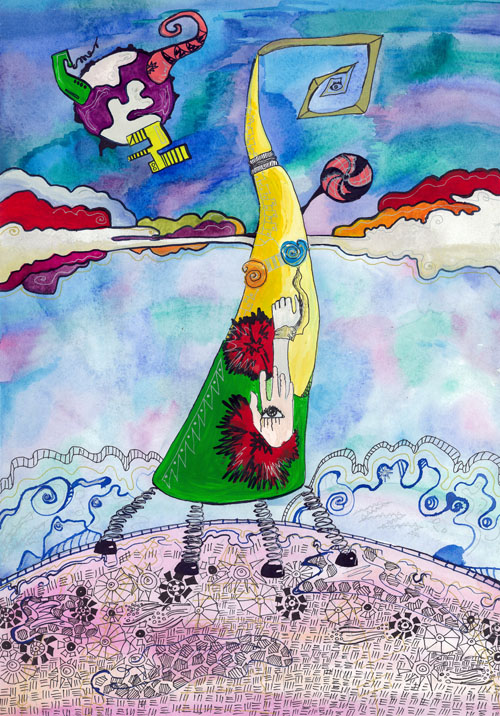 Все вместе мы постарались графически выразить свои впечатления от гениальной сказки Льюиса Кэрролла «Алиса в стране чудес». В этой сказке тонкое переплетение реального и фантастического, каламбуров, соединения несоединимого, и наоборот разъединения неразрывно связанного, абсурд с одной стороны и величайшая глубина мысли с другой. Всё это, надеюсь, отразилось в картинах. Они полны аллюзий и ассоциаций. Но личность авторов и их богатое воображение не могли не отразится на иллюстрациях так же. Выставка — это Кэрролл в современном прочтении, это не буквальный пересказ, а творческое переосмысление, «Алиса в стране чудес» через призму современности. Все работы объединяет техника пуантели, только она могла показать всю тонкость и изящество ткани кэрролловского текста. В эпизоде, когда Голубка доказывает Алисе, почему та змея, если присмотреться к «доводам» Голубки оказывается, что нонсенс, на первый взгляд, не имеющий обоснований, логически выстроен и математически обусловлен. Нужно всего лишь сменить систему координат или точку отсчета.