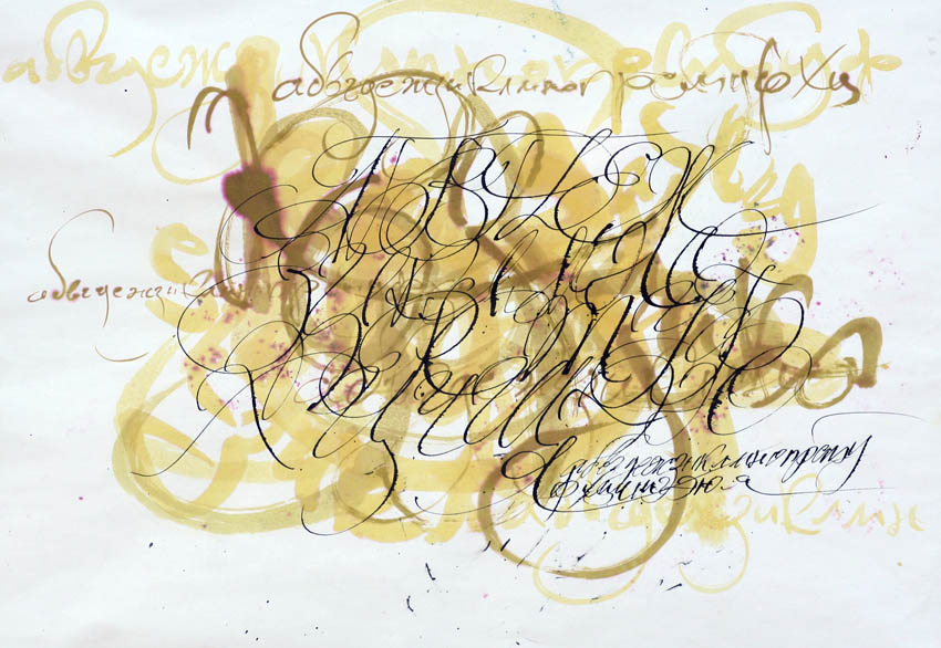 На открытии выставки, когда под ритмическое сопровождение дуэта барабанов перформанс проводил Дмитрий Рыжов, пробовали свои силы в художественной каллиграфии и юные, и маститые. Между прочим, когда говоришь с художником о концепции выставки, он меняет свои взгляды. Так было и на этот раз с одним из взрослых экспонентов, который вначале хотел забрать свои графические листы.