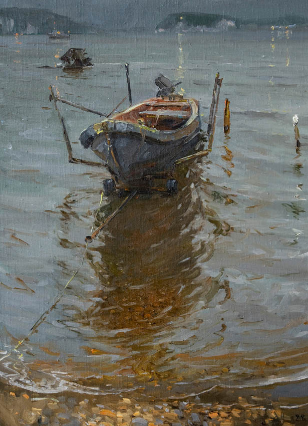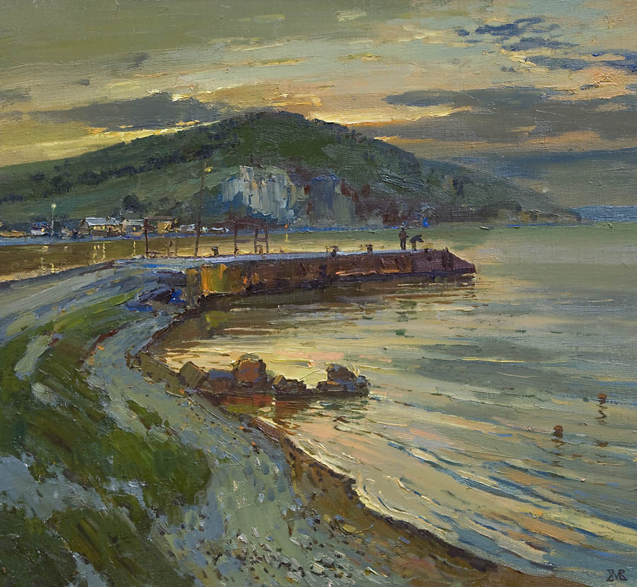 Недавно прошёл день города. Тема города не теряет своей актуальности ни в сознании простых людей, ни в сознании художников. Разные города, разные краски и техники. Художники часто экспериментируют с урбанистическим пространством. Например, у Марка Шагала город — это слияние маленького городка под Витебском и огромного Парижа. А у Бориса Кустодиева на полотнах появляется город без точного места на карте, но бесконечно близкий Поволжью, хотя сам Кустодиев жил в Санкт-Петербурге. Подобных примеров масса. Но всегда есть характерные черты, что-то, по чему мы узнаем город. В работах Виктории Косенко — все приметы города Владивостока: порт, вокзал, море, станция Моргородок, корабли, лодки, пирсы и рыбаки. Но если с пространством всё ясно, то время — явный эксперимент, оно или почти ускользает, или собирается в нечто единое, и старый и новый Владивосток вступают в диалог. Диалог продолжается и на уровне цветовой гаммы, где серый — доминанта. Он не кричит, а спокойно спрашивает. Серый цвет здесь и основной, и фоновый. На нём может яркой вспышкой расцветиться часть пейзажа, или вода утонуть в рефлексах от кораблей. Когда он основной: он убирает пестроту, даёт отдых глазу, погружает в созерцание неброской красоты. Это поэтика серого.