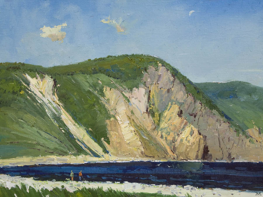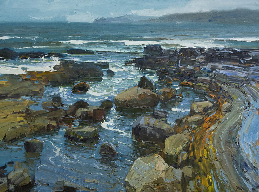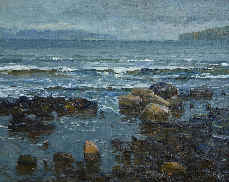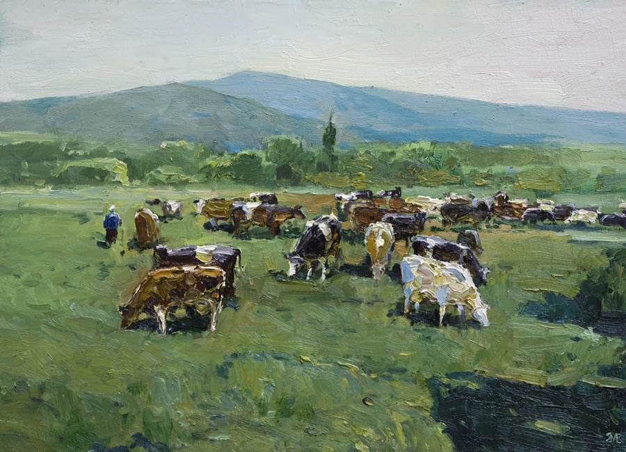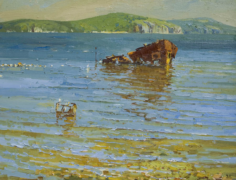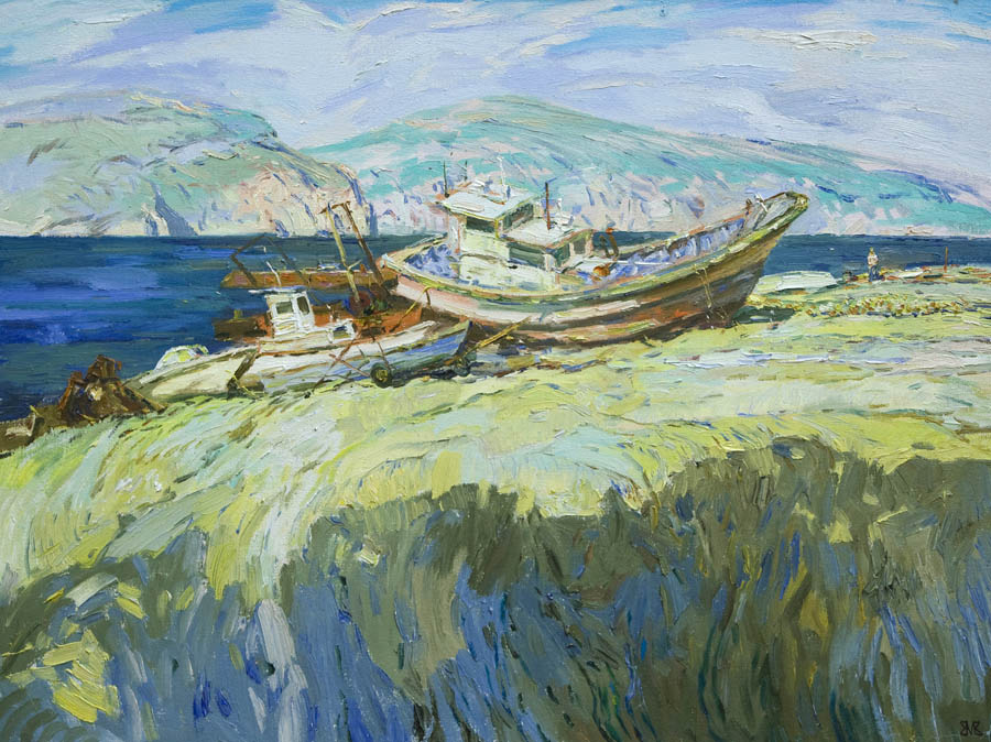 Европа Марии Холмогоровой — и канон, и оригинальная интерпретация мифа. У быка-Зевса нет золотых рогов, он не рассекает бурную воду океана, унося Европу от подруг. И жизнерадостная Европа, и Зевс, то бишь, бык, – обитатели острова Русский, излюбленного художниками места пленэров. Но при внимательном рассмотрении понимаешь, что попытка найти первооснову явно обозначена, не смотря на местный колорит. К слову, о ежегодных пленэрах: проходящие на островах близ Владивостока или непосредственно на побережье, они, как глоток свежей влаги. Моменты общения с природой, натурные наблюдения оттачивают мастерство, делают более уверенной руку художника. Тонкие по цвету этюды, натюрморты на морскую тему рождаются после таких поездок. И в этой выставке они представлены. И снова прочитывается подтекст, в котором природа выступает не только в роли копилки впечатлений, но и в роли Материи, Земли, энергией и силой которой питался Антей.