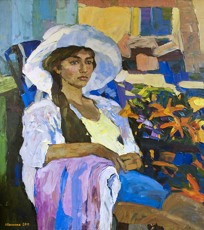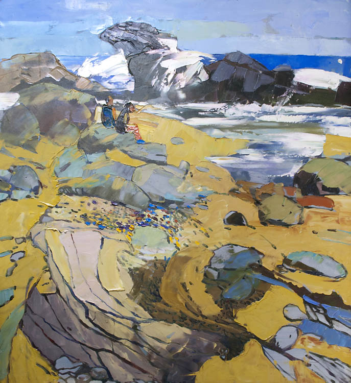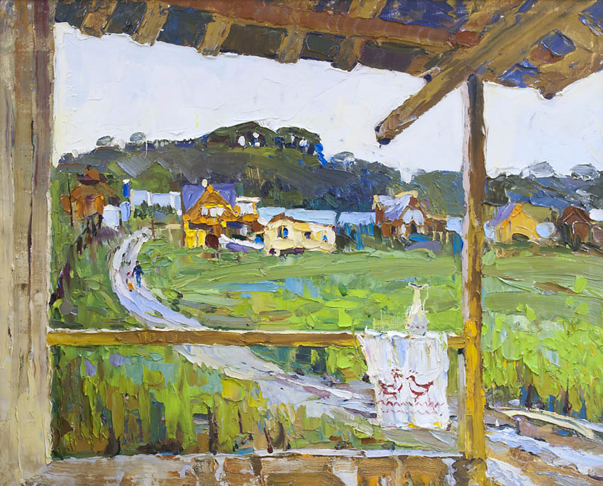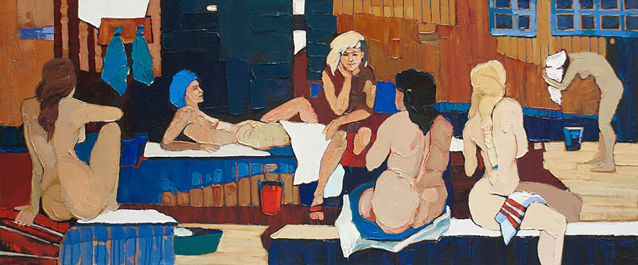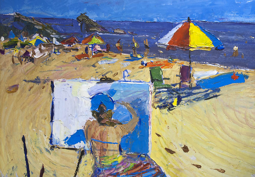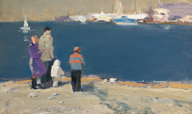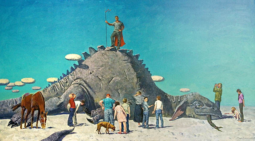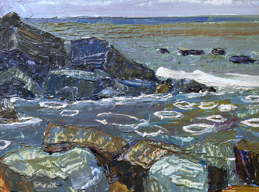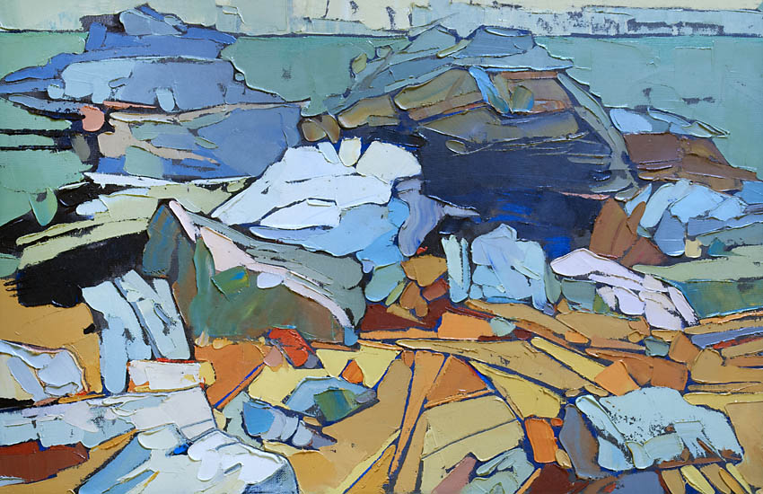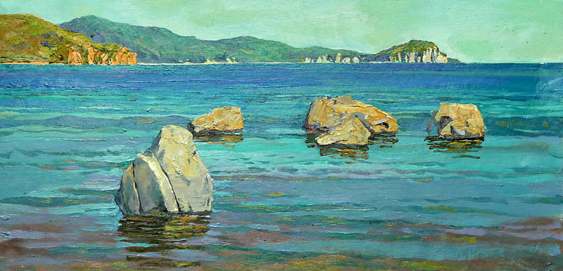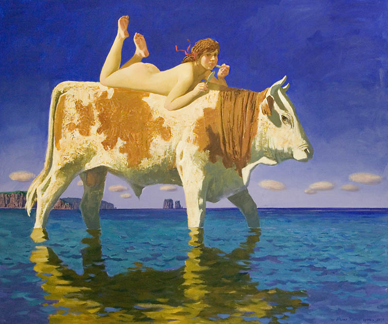 Европа Марии Холмогоровой — и канон, и оригинальная интерпретация мифа. У быка-Зевса нет золотых рогов, он не рассекает бурную воду океана, унося Европу от подруг. И жизнерадостная Европа, и Зевс, то бишь, бык, – обитатели острова Русский, излюбленного художниками места пленэров. Но при внимательном рассмотрении понимаешь, что попытка найти первооснову явно обозначена, не смотря на местный колорит. К слову, о ежегодных пленэрах: проходящие на островах близ Владивостока или непосредственно на побережье, они, как глоток свежей влаги. Моменты общения с природой, натурные наблюдения оттачивают мастерство, делают более уверенной руку художника. Тонкие по цвету этюды, натюрморты на морскую тему рождаются после таких поездок. И в этой выставке они представлены. И снова прочитывается подтекст, в котором природа выступает не только в роли копилки впечатлений, но и в роли Материи, Земли, энергией и силой которой питался Антей.
