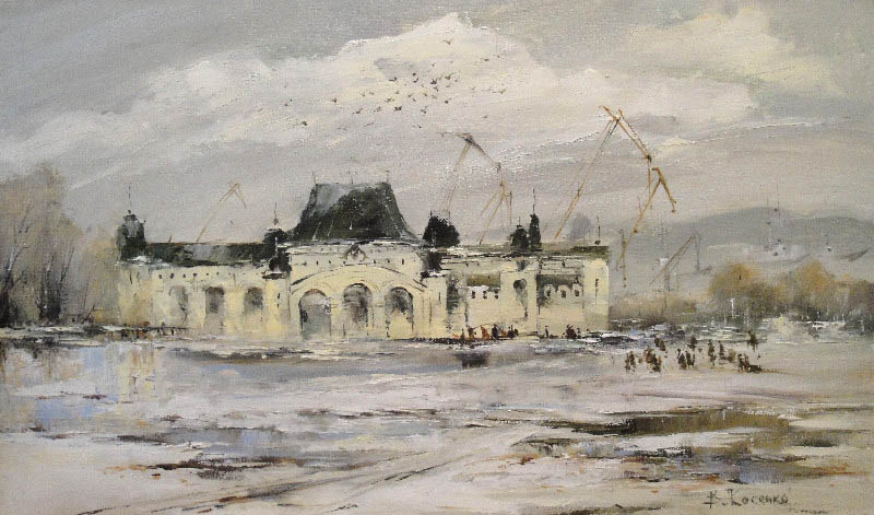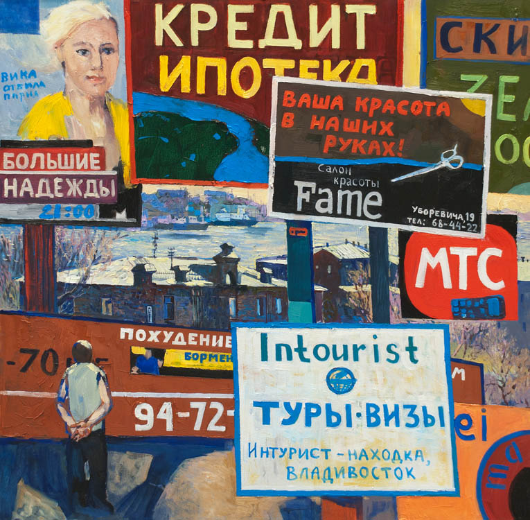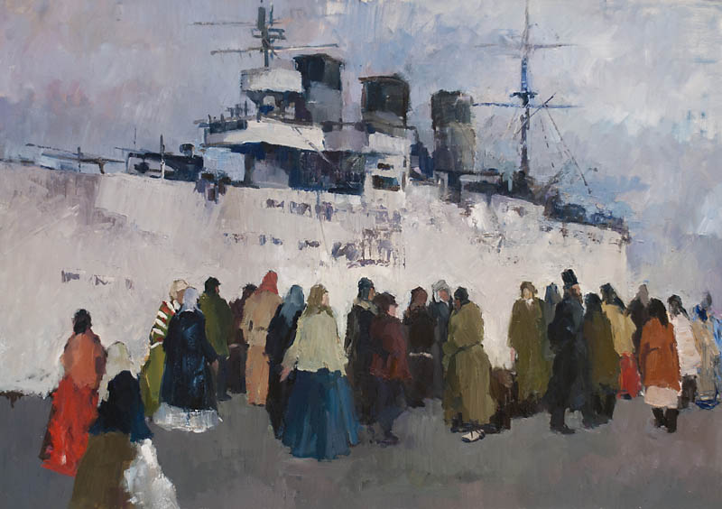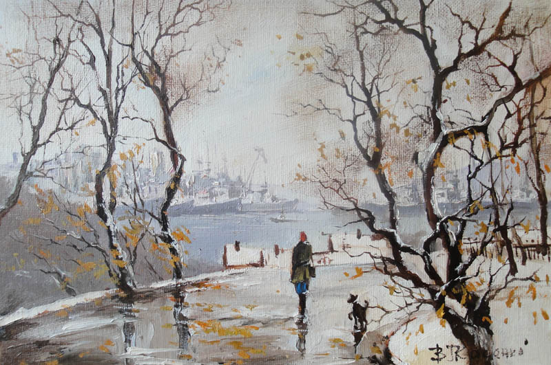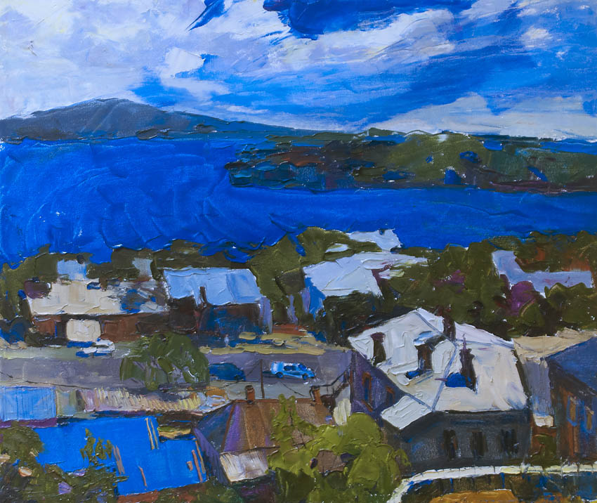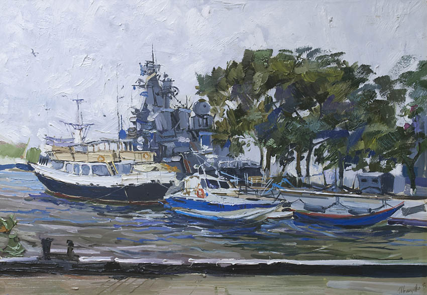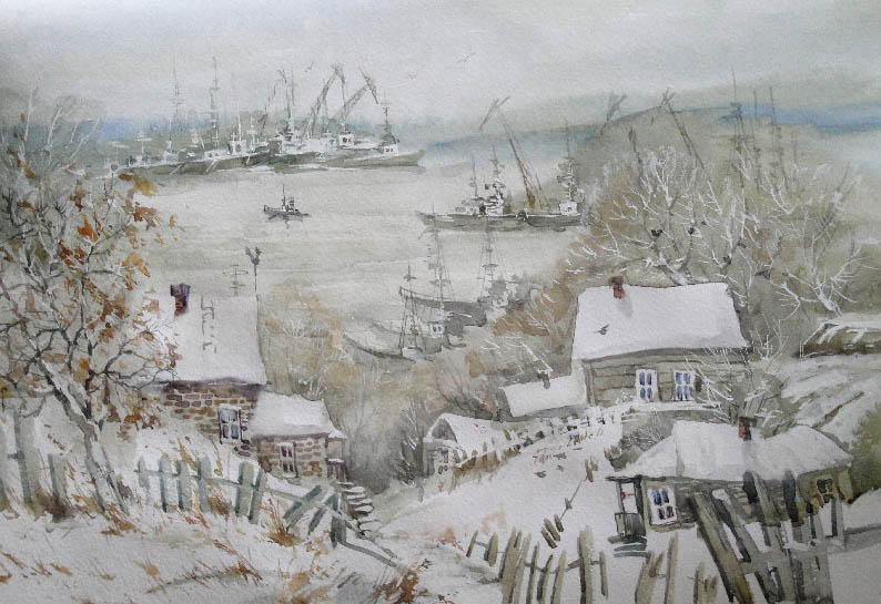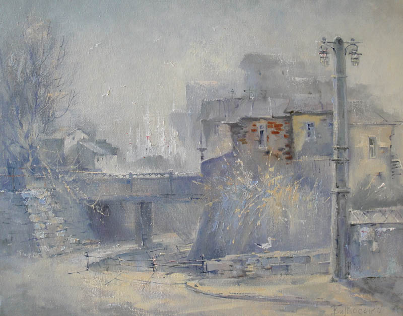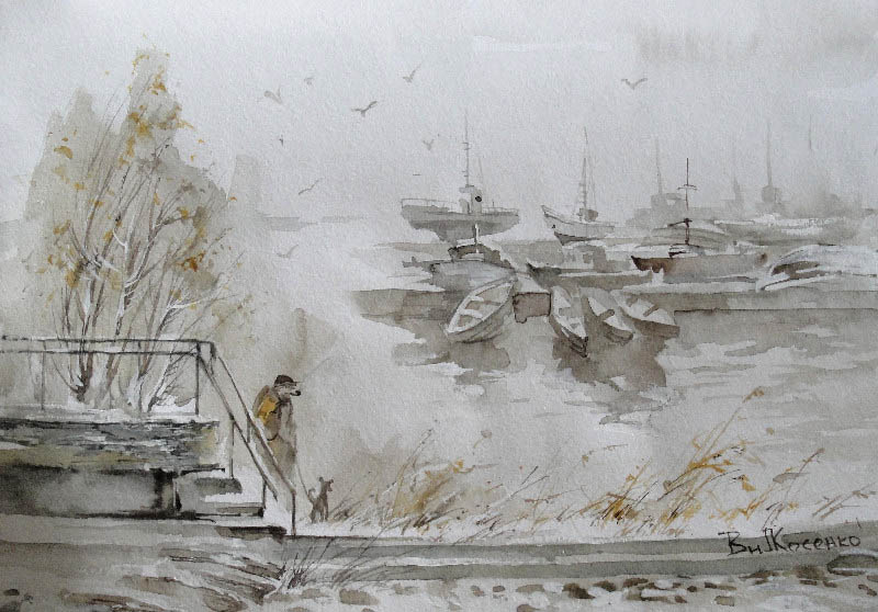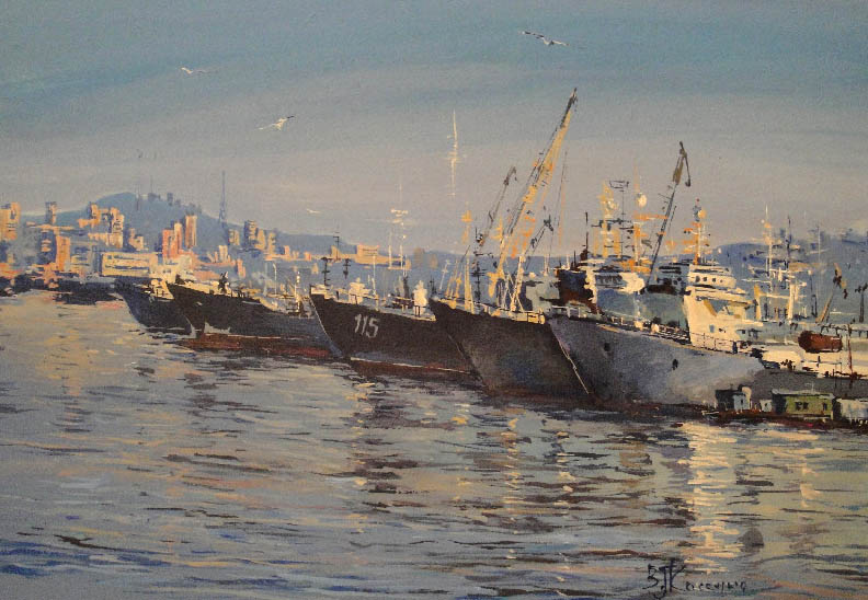 Недавно прошёл день города. Тема города не теряет своей актуальности ни в сознании простых людей, ни в сознании художников. Разные города, разные краски и техники. Художники часто экспериментируют с урбанистическим пространством. Например, у Марка Шагала город — это слияние маленького городка под Витебском и огромного Парижа. А у Бориса Кустодиева на полотнах появляется город без точного места на карте, но бесконечно близкий Поволжью, хотя сам Кустодиев жил в Санкт-Петербурге. Подобных примеров масса. Но всегда есть характерные черты, что-то, по чему мы узнаем город. В работах Виктории Косенко — все приметы города Владивостока: порт, вокзал, море, станция Моргородок, корабли, лодки, пирсы и рыбаки. Но если с пространством всё ясно, то время — явный эксперимент, оно или почти ускользает, или собирается в нечто единое, и старый и новый Владивосток вступают в диалог. Диалог продолжается и на уровне цветовой гаммы, где серый — доминанта. Он не кричит, а спокойно спрашивает. Серый цвет здесь и основной, и фоновый. На нём может яркой вспышкой расцветиться часть пейзажа, или вода утонуть в рефлексах от кораблей. Когда он основной: он убирает пестроту, даёт отдых глазу, погружает в созерцание неброской красоты. Это поэтика серого.