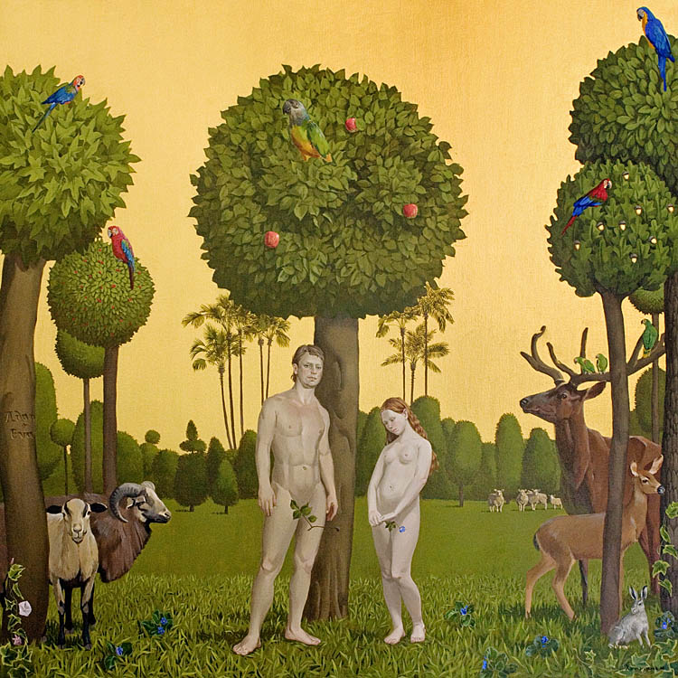 Наконец, в одной из самых ярких работ, удивительной по цвету, живописным качествам, «Эдем» запечатлён вечный сюжет, относящий нас к первооснове бытия. Адам и Ева до изгнания из рая. К теме Адама и Евы в мировой живописи обращались неоднократно: Мазаччо, Дюрер, Бальдунг Грин, Гольциус, Рембрандт, Кранах, Ван Эйк, Микеланджело… Жизнь первых людей, сотворённых богом, подробно описана в Пятикнижии: создание Творцом человека, а после из его ребра женщины, искушение, грехопадение, изгнание из Эдема, расселение людей по миру после пребывания в Эдемском саду. Для того, чтобы понять популярность ветхозаветного сюжета в мировом искусстве, следует вспомнить трактовку истории грехопадения христианскими теологами. Ева, искушённая змеем, отведала запретный плод с дерева познания Добра и Зла. Уговорила Адама сделать то же самое. Бог, узнав о проступке, пришел в негодование и выгнал их из рая. Отныне люди стали смертными. По Библии изгнание из рая — начало земной жизни человека. Нашей жизни со всеми её превратностями и радостями.