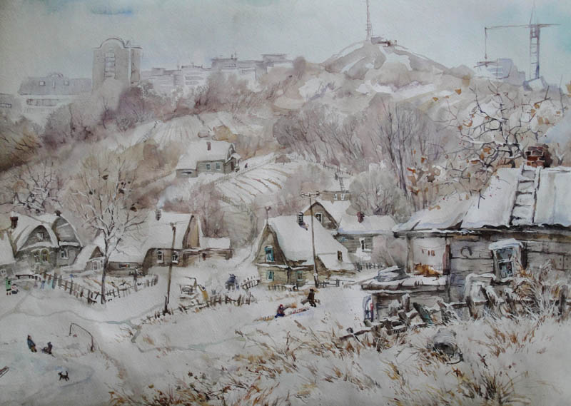 Камчатка — удивительное, почти сказочное место. Край снегов, гейзеров, вулканов, в том числе и действующих, гор и морских котиков. Где ещё в России можно найти подобное? Место уникально и в мировом масштабе. О Камчатке пишут давно и много. Вот, например С.П. Крашенинников в «Описании земли Камчатки». Эта книга не оставила равнодушным «солнце русской поэзии» — Александра Сергеевича Пушкина, который составил «Заметки при чтении “Описания земли Камчатки С.П. Крашенинникова”». Но не только писателей и геологов волновала и по-прежнему волнует Камчатка, её удивительный ландшафт не оставляет равнодушными и художников. Владимир Позигун — известный приморский художник предлагает вниманию серию графических пейзажей Камчатки. Творческое сознание всегда восприимчиво к красоте, которой в камчатской земле предостаточно. Уникальные флора и фауна, рельеф, снега, вдохновляющие своей белизной, как и чистая бумага, на которой художник оставил свои впечатления. И монохромность работ ассоциативно подчеркивает связь с зимним периодом. Вулканы, привлекающие своим величием и вызывающие почти первобытный страх, это напоминание о мощи природы. В этих работах зритель чувствует величие природы, на фоне которой человек всегда мал. Маленькие домики, затерявшиеся в гористой местности.